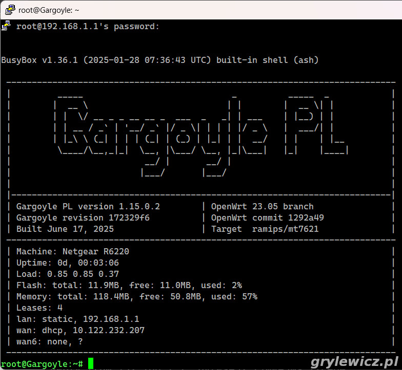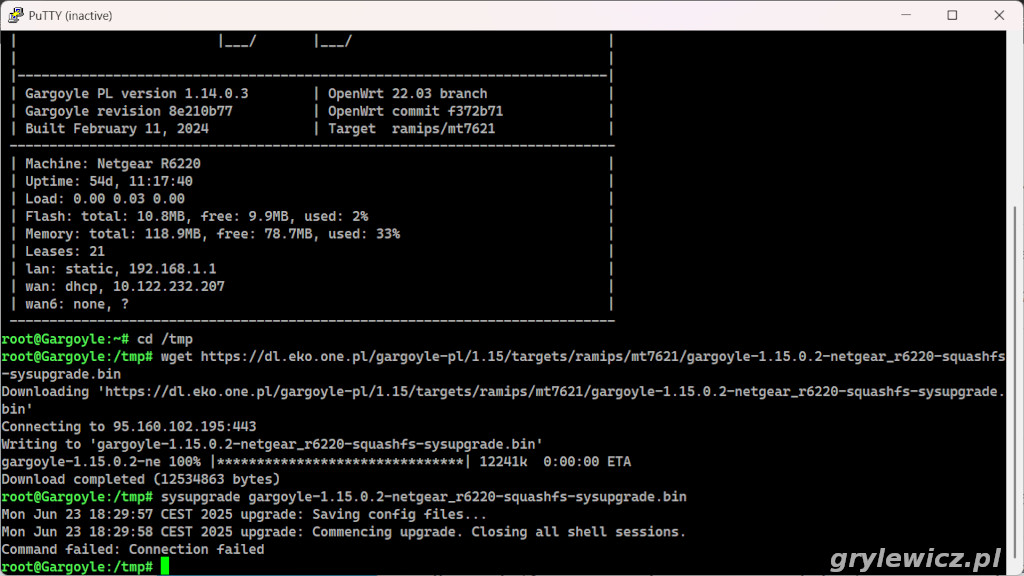 Stali czytelnicy pewnie kojarzą, że bardzo lubię routery z linuksem na pokładzie. Od lat używam Netgeara R6220. Nie dość, że jest tani w zakupie, to jeszcze świetnie się sprawdza w moim domowym labie. Używam systemu Gargoyle (taka nakładka na OpenWRT), który pobieram ze strony Cezarego – eko.one.pl. Mimo że system posiada wygodne GUI, to fajnie też pobawić się z poziomu konsoli, gdzie często widać znacznie więcej, niż w interfejsie graficznym. Dzisiaj opiszę jak w wierszu poleceń zrobić upgrade systemu do wyższej wersji.