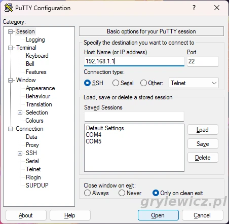 Do zestawienia sesji SSH potrzebny jest klient, np. stary, dobry i ciągle aktualizowany PuTTY. W linuksie i nawet (od jakiegoś czasu) w Windowsie jest też tekstowy ssh. W graficznym PuTTY połączenie wygląda tak: